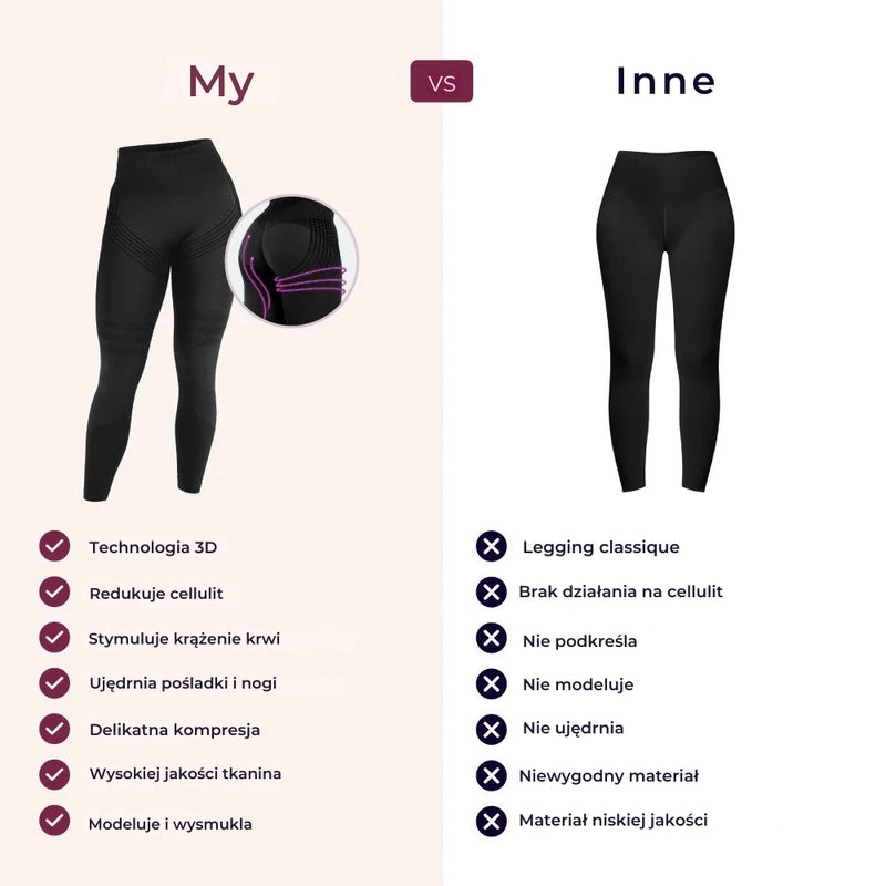 Kompresja 3D tworzy naturalny opór, który aktywuje mięśnie przy każdym ruchu. Ta stymulacja poprawia jędrność nóg i pomaga zmniejszać cellulit dzięki lepszemu krążeniu krwi.